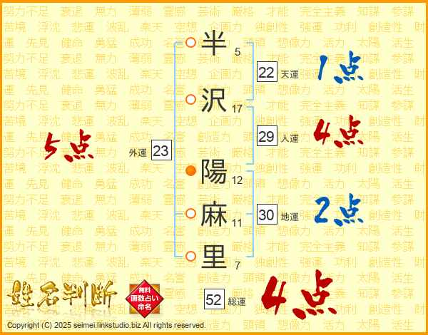 半(5画)沢(17画) 陽(12画)麻(11画)里(7画)