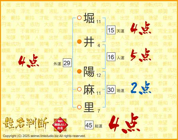 堀(11画)井(4画) 陽(12画)麻(11画)里(7画)