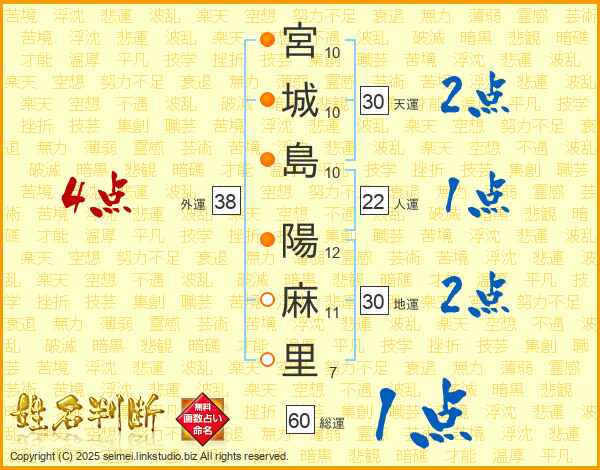 宮(10画)城(10画)島(10画) 陽(12画)麻(11画)里(7画)