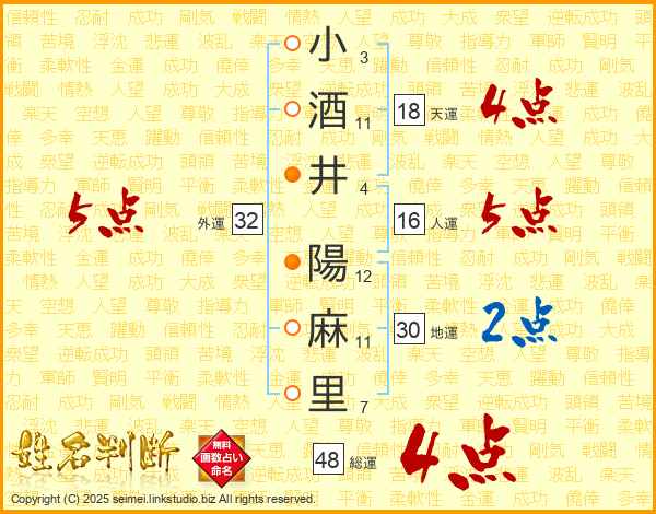 小(3画)酒(11画)井(4画) 陽(12画)麻(11画)里(7画)