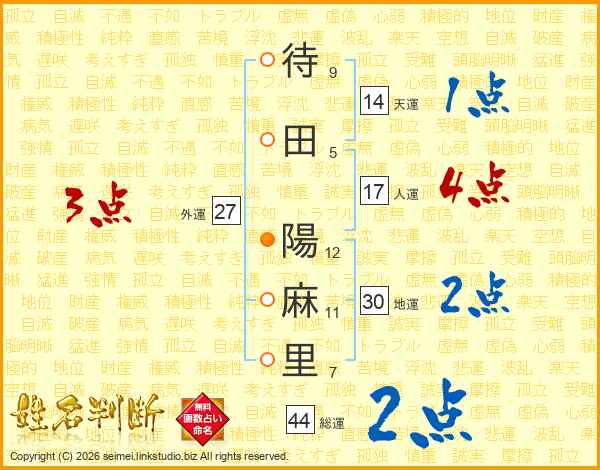 待(9画)田(5画) 陽(12画)麻(11画)里(7画)