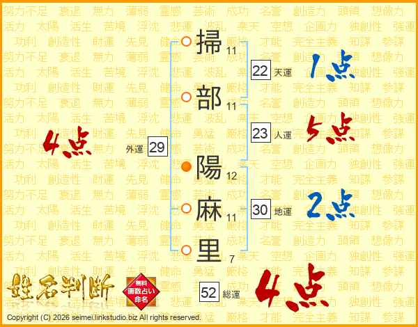 掃(11画)部(11画) 陽(12画)麻(11画)里(7画)