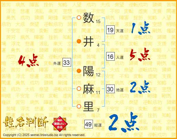 数(15画)井(4画) 陽(12画)麻(11画)里(7画)