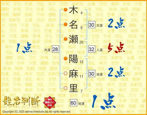 木(4画)名(6画)瀬(20画) 陽(12画)麻(11画)里(7画)