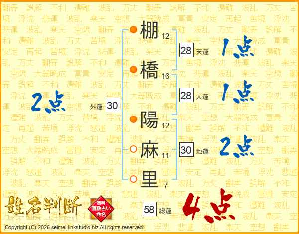 棚(12画)橋(16画) 陽(12画)麻(11画)里(7画)