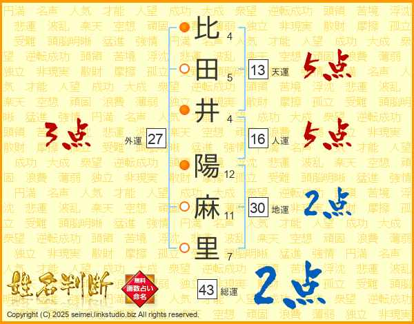 比(4画)田(5画)井(4画) 陽(12画)麻(11画)里(7画)