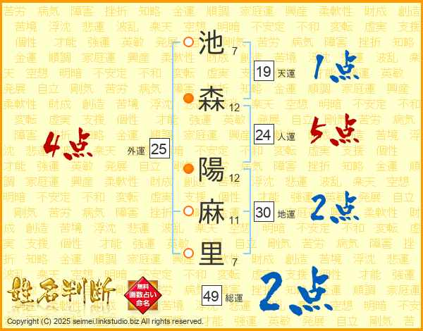 池(7画)森(12画) 陽(12画)麻(11画)里(7画)