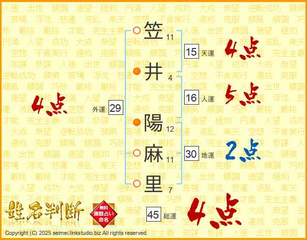 笠(11画)井(4画) 陽(12画)麻(11画)里(7画)