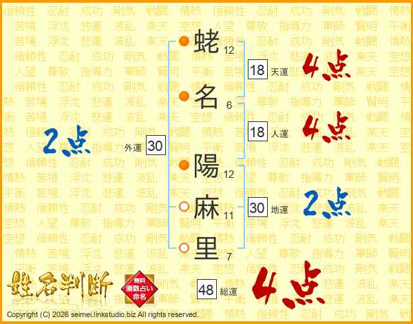 蛯(12画)名(6画) 陽(12画)麻(11画)里(7画)