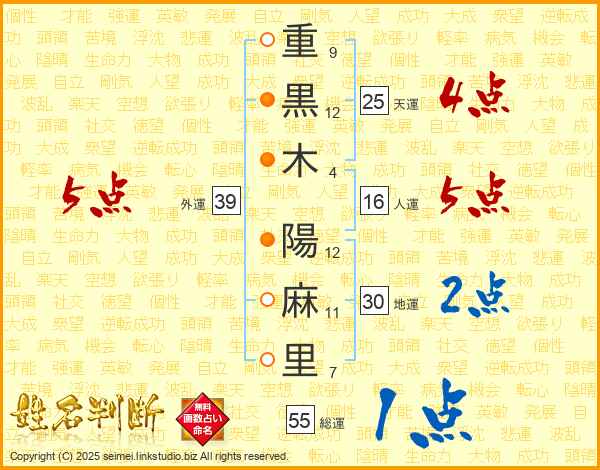重(9画)黒(12画)木(4画) 陽(12画)麻(11画)里(7画)
