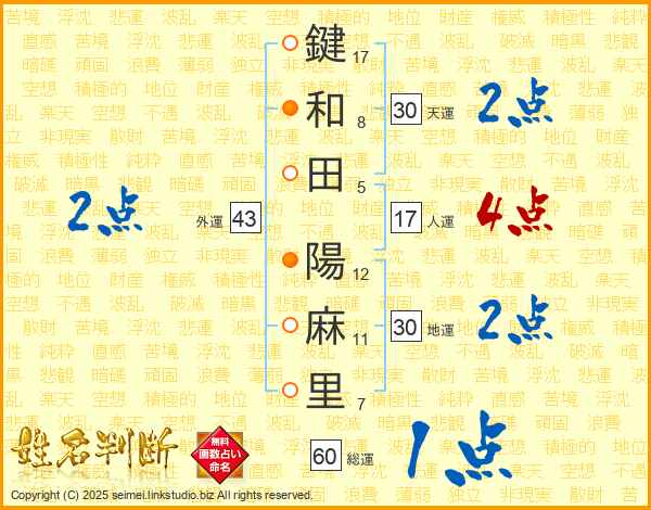 鍵(17画)和(8画)田(5画) 陽(12画)麻(11画)里(7画)