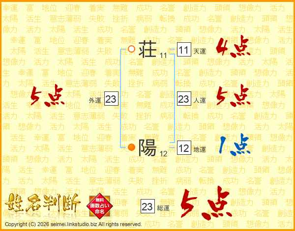 生活面を象徴する運勢です。外部から受ける影響力を表し、結婚運、家庭運や職場、環境への順応性を表します。総運から人運を引いた画数。姓や名が1文字の場合を除く。