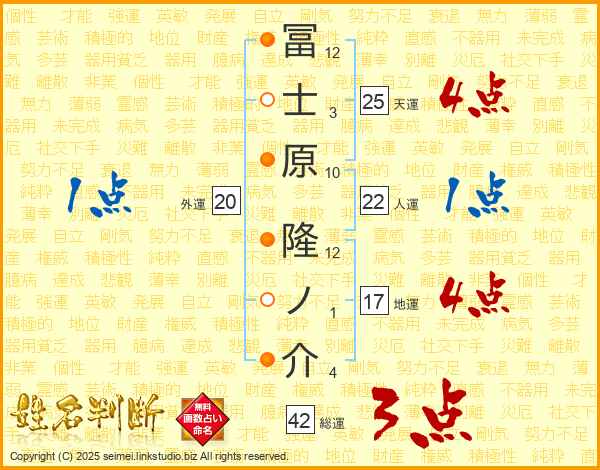 冨(12画)士(3画)原(10画) 隆(12画)ノ(1画)介(4画)