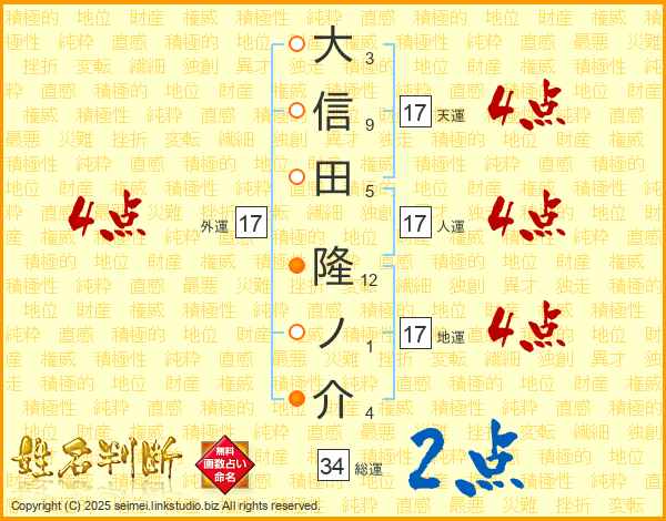 大(3画)信(9画)田(5画) 隆(12画)ノ(1画)介(4画)