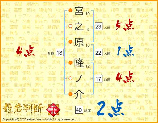 宮(10画)之(3画)原(10画) 隆(12画)ノ(1画)介(4画)