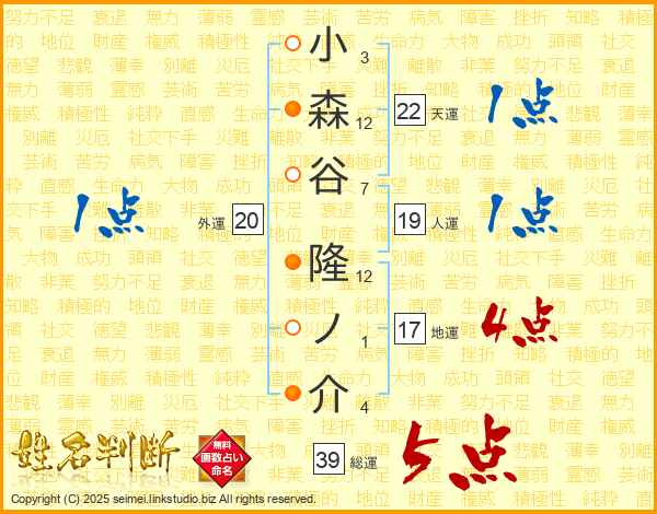 小(3画)森(12画)谷(7画) 隆(12画)ノ(1画)介(4画)