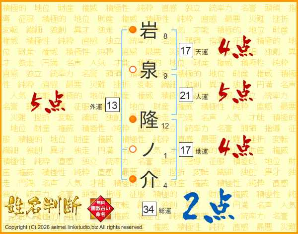 岩(8画)泉(9画) 隆(12画)ノ(1画)介(4画)