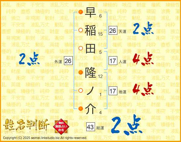 早稲田隆ノ介さんの総運は43画の2点!