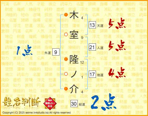 木(4画)室(9画) 隆(12画)ノ(1画)介(4画)