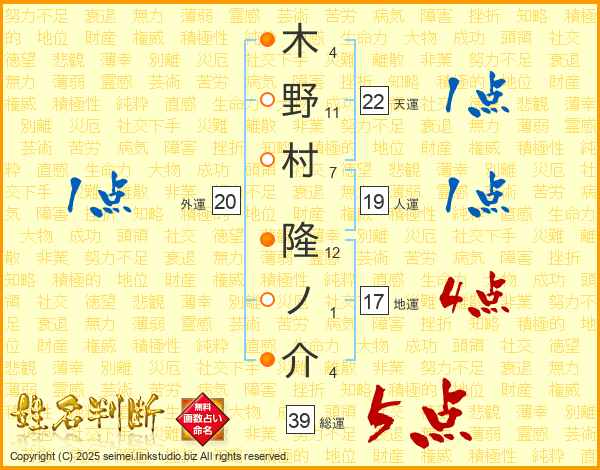 木野村隆ノ介さんの総運は39画の5点!