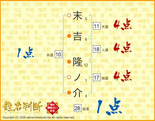 末(5画)吉(6画) 隆(12画)ノ(1画)介(4画)