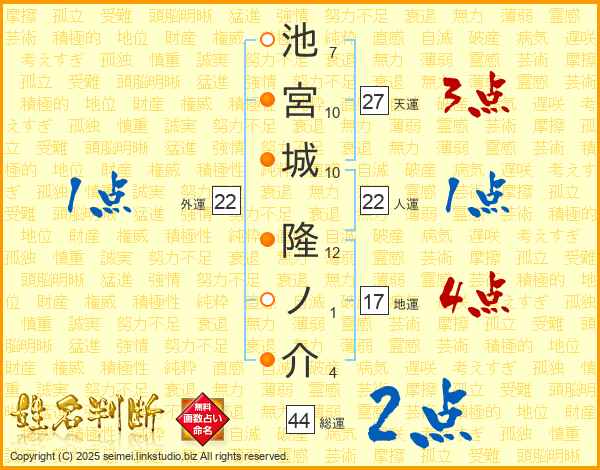 池(7画)宮(10画)城(10画) 隆(12画)ノ(1画)介(4画)