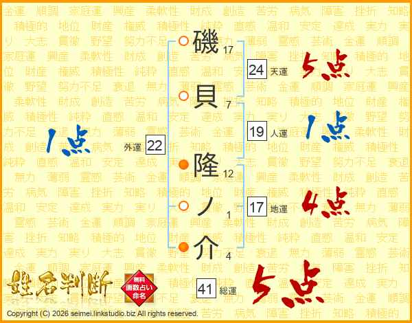 磯貝隆ノ介さんの総運は41画の5点!