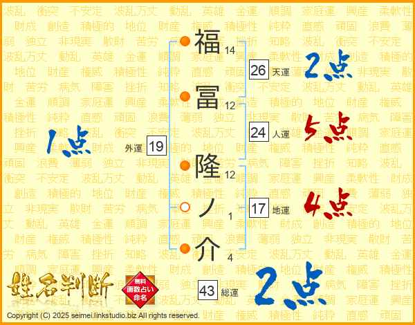福(14画)冨(12画) 隆(12画)ノ(1画)介(4画)
