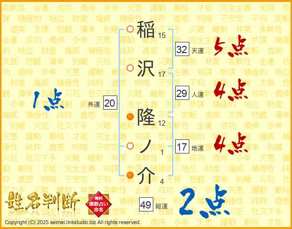 稲(15画)沢(17画) 隆(12画)ノ(1画)介(4画)