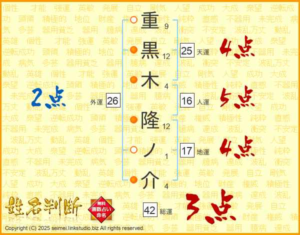 重(9画)黒(12画)木(4画) 隆(12画)ノ(1画)介(4画)