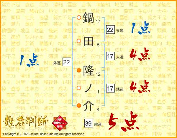 鍋(17画)田(5画) 隆(12画)ノ(1画)介(4画)