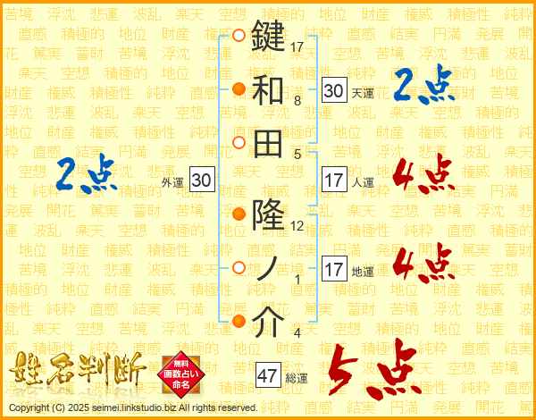 鍵(17画)和(8画)田(5画) 隆(12画)ノ(1画)介(4画)