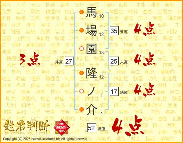 馬場園隆ノ介さんの総運は52画の4点!