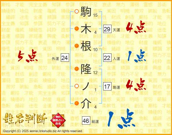 駒木根隆ノ介さんの総運は46画の1点!