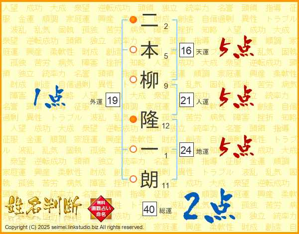 あなたの人生を表す1番重要な運勢です。生涯を通じて影響する総合運となり、主に50歳以降の晩年期に影響を及ぼします。苗字と名前の合計画数。
