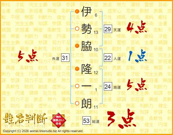 伊(6画)勢(13画)脇(10画) 隆(12画)一(1画)朗(11画)