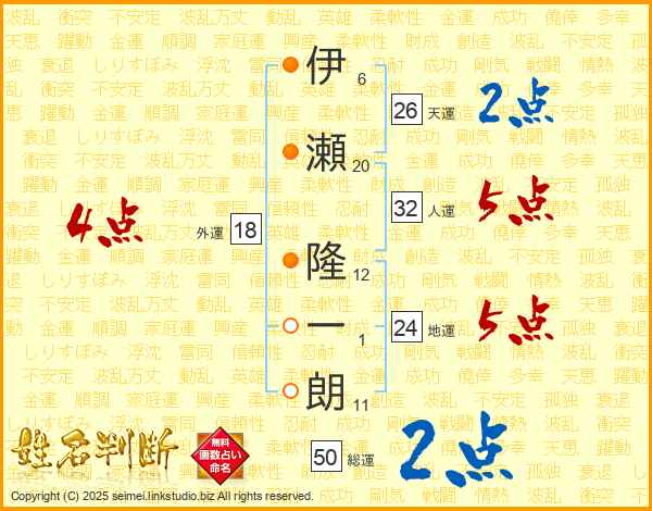 伊(6画)瀬(20画) 隆(12画)一(1画)朗(11画)