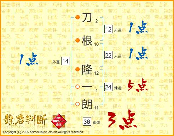 刀(2画)根(10画) 隆(12画)一(1画)朗(11画)
