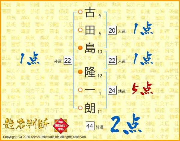 古(5画)田(5画)島(10画) 隆(12画)一(1画)朗(11画)