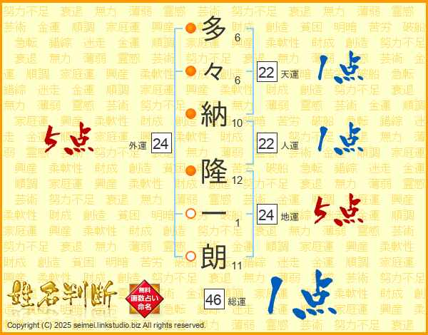 多(6画)々(6画)納(10画) 隆(12画)一(1画)朗(11画)