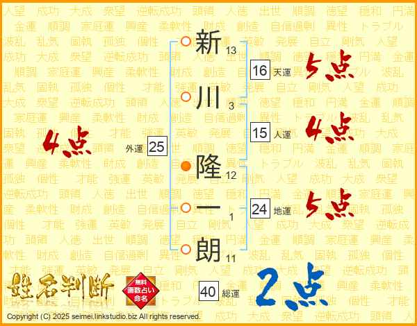 新(13画)川(3画) 隆(12画)一(1画)朗(11画)