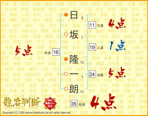 日(4画)坂(7画) 隆(12画)一(1画)朗(11画)
