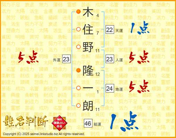 木(4画)住(7画)野(11画) 隆(12画)一(1画)朗(11画)