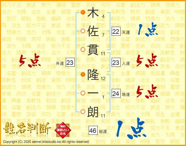 木(4画)佐(7画)貫(11画) 隆(12画)一(1画)朗(11画)
