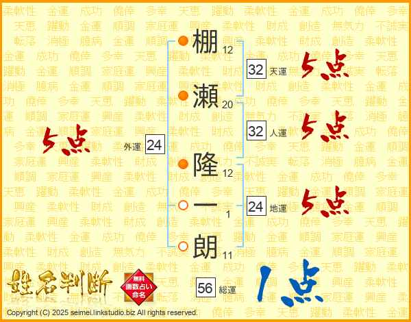 棚(12画)瀬(20画) 隆(12画)一(1画)朗(11画)