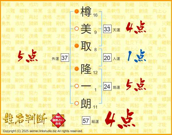 樽(16画)美(9画)取(8画) 隆(12画)一(1画)朗(11画)