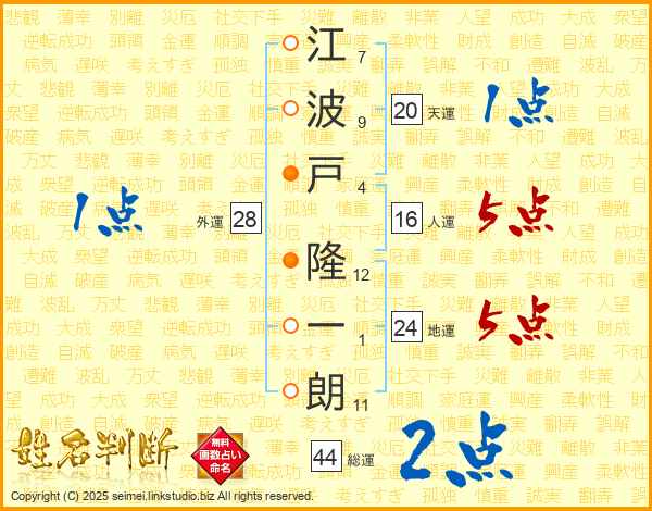 江(7画)波(9画)戸(4画) 隆(12画)一(1画)朗(11画)