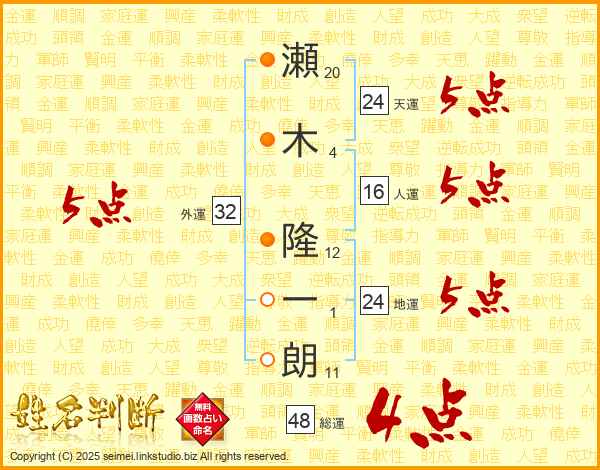 瀬(20画)木(4画) 隆(12画)一(1画)朗(11画)