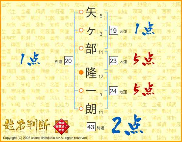 矢ヶ部隆一朗さんの人運は23画の5点!