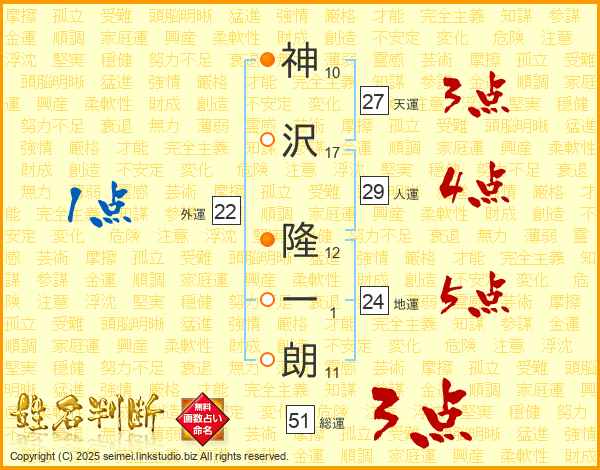 神(10画)沢(17画) 隆(12画)一(1画)朗(11画)